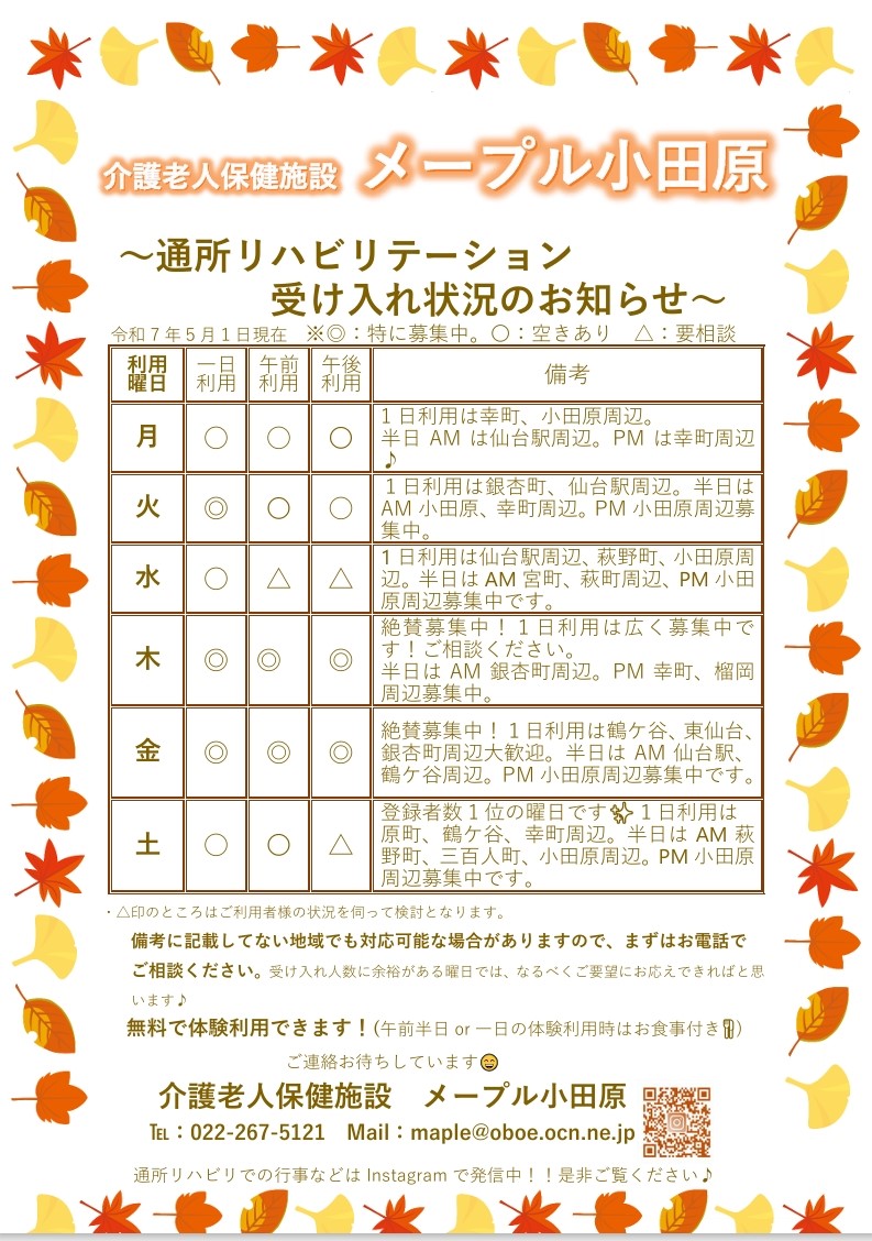 通所リハビリ 空き状況(R7/5/1)