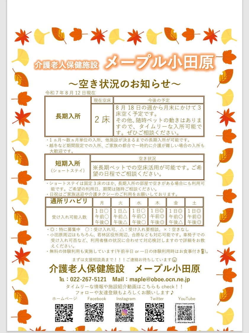 長期・短期入所、通所リハビリ 空き状況(R7/8/13)