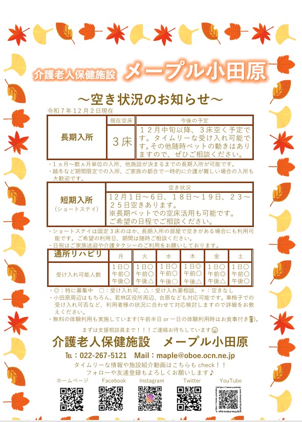 長期・短期入所、通所リハビリ 空き状況(R7/12/2)